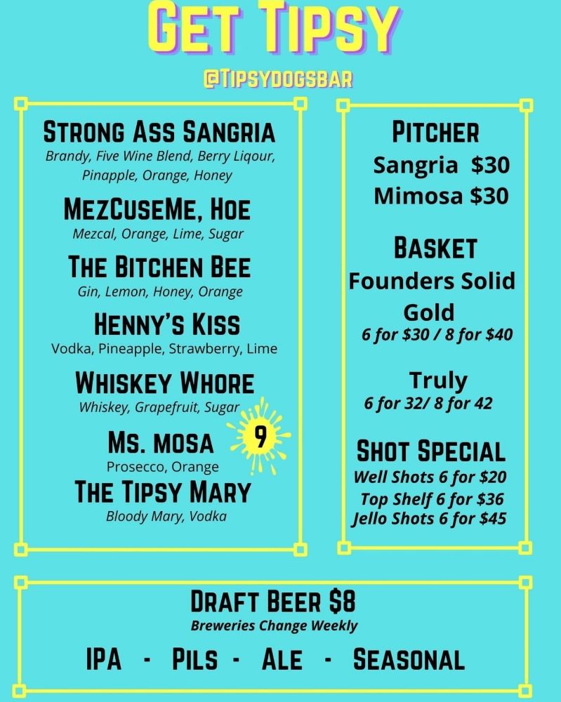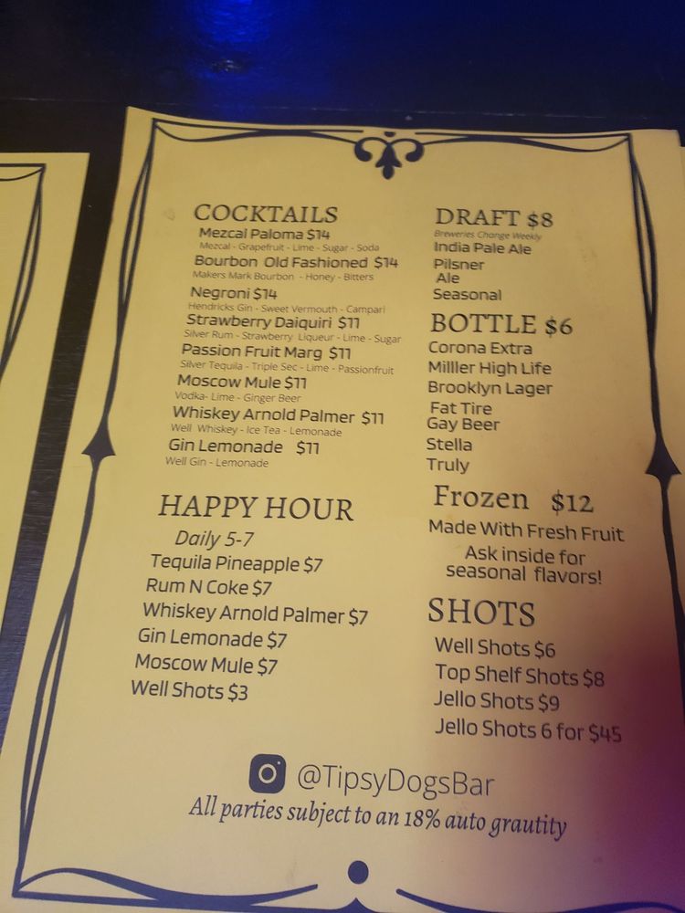 Introducing the menu at Tipsy Dog's Bar, located in Brooklyn, NY, offers a range of delicious burgers with vegan and vegetarian options available. The bar is known for its cozy and casual atmosphere, complete with a full bar, happy hour specials, and even welcomes dogs. Along with excellent service and free Wi-Fi, customers rave about the strong drinks, flavorful burgers, and upbeat music. The Butcher's Burger, paired with a mezcal negroni, is a standout favorite among patrons. With a diverse selection of beverages and tasty bar snacks, Tipsy Dog's Bar is the perfect spot for late-night drinks with friends or a relaxing Saturday brunch. Despite some minor hiccups in service, the overall experience at Tipsy Dog's Bar is sure to leave you coming back for more.